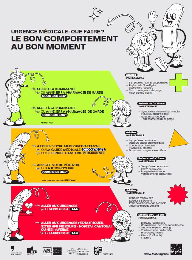 Vous trouverez en pièce jointe l'affiche conçue par l'Etat de Fribourg en collaboration avec l'HFR, l'HIB, la société des pharmaciens Fribourgeois et les MF, ce document vous informe sur les bons comportements à adopter en cas d'urgence médicale.